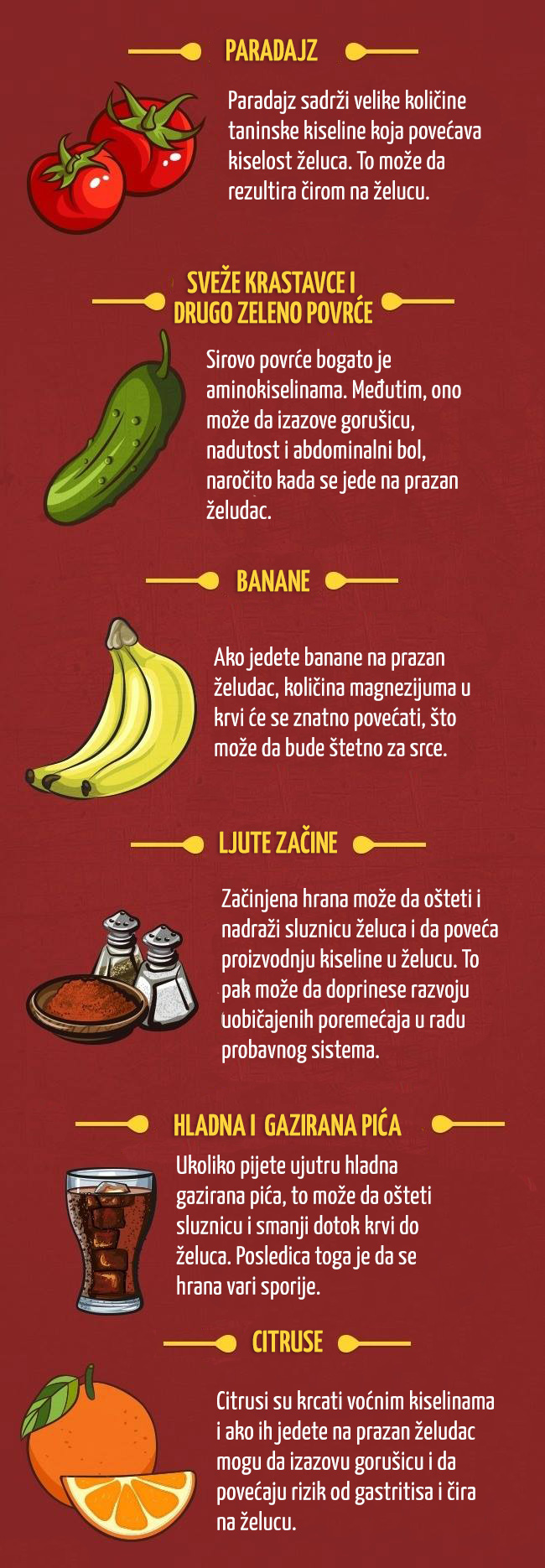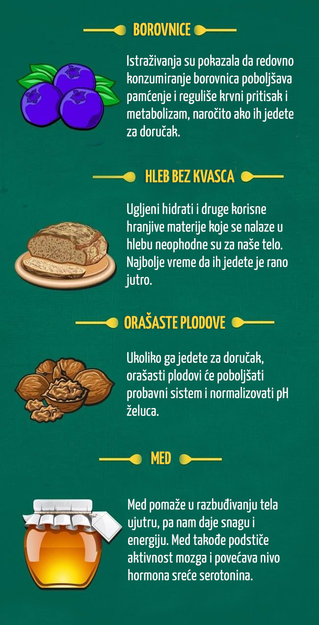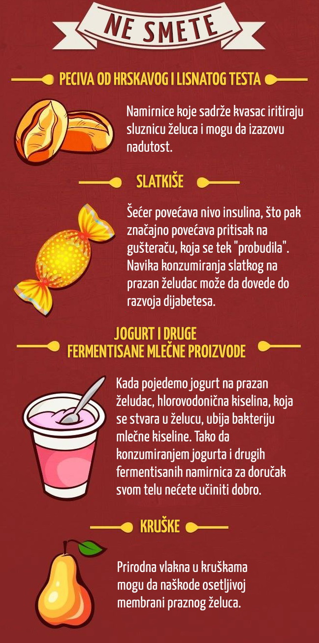 Nažalost, ne znaju svi da postoje namirnice koje se ne poreporučuju konzumirati na prazan stomak. Pripremili smo razumljivu infografiku koja će pomoći da se shvati, šta se smije, a šta ne smije jesti ujutro, piše uspesnazena.com: