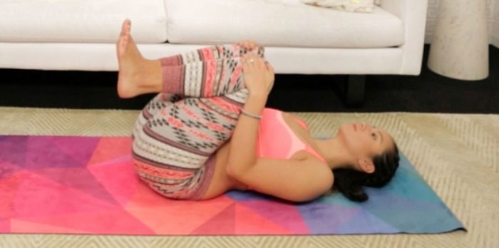 Lezite na leđa i opustite se. Duboko udahnite i privucite kolena ka grudima, obuhvativši ih rukama. Polako pridignite karlicu gore i zadržite se u ovom položaju 1 minut. Dišite ravnomerno.