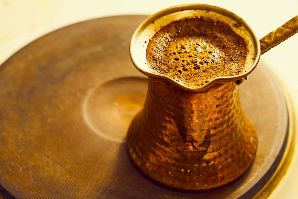 U džezvu uspite dvije kašike šećera i stavite je na šporet. Sačekajte da šećer počne da se karamelizuje, pa dodajte 1 dl vode i 2-3 kašičice kafe. Kada se kafa počne da raste i skoro dođe do vrha džezve, ne treba da čekate da proključa, već je odmah sklonite sa vatre. U kafu možete dodati začine po ukusu – cimet i kardamom će joj dati suptilnu aromu, a crni biber i so će poboljšati ukus.
